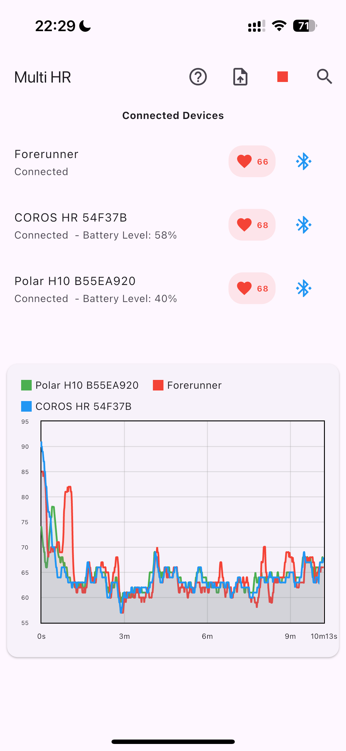 MultiHR 帮助研究人员、教练和设备测试者连接多台 BLE 心率设备,实时查看曲线,记录同步会话,并导出可用于研究的数据。